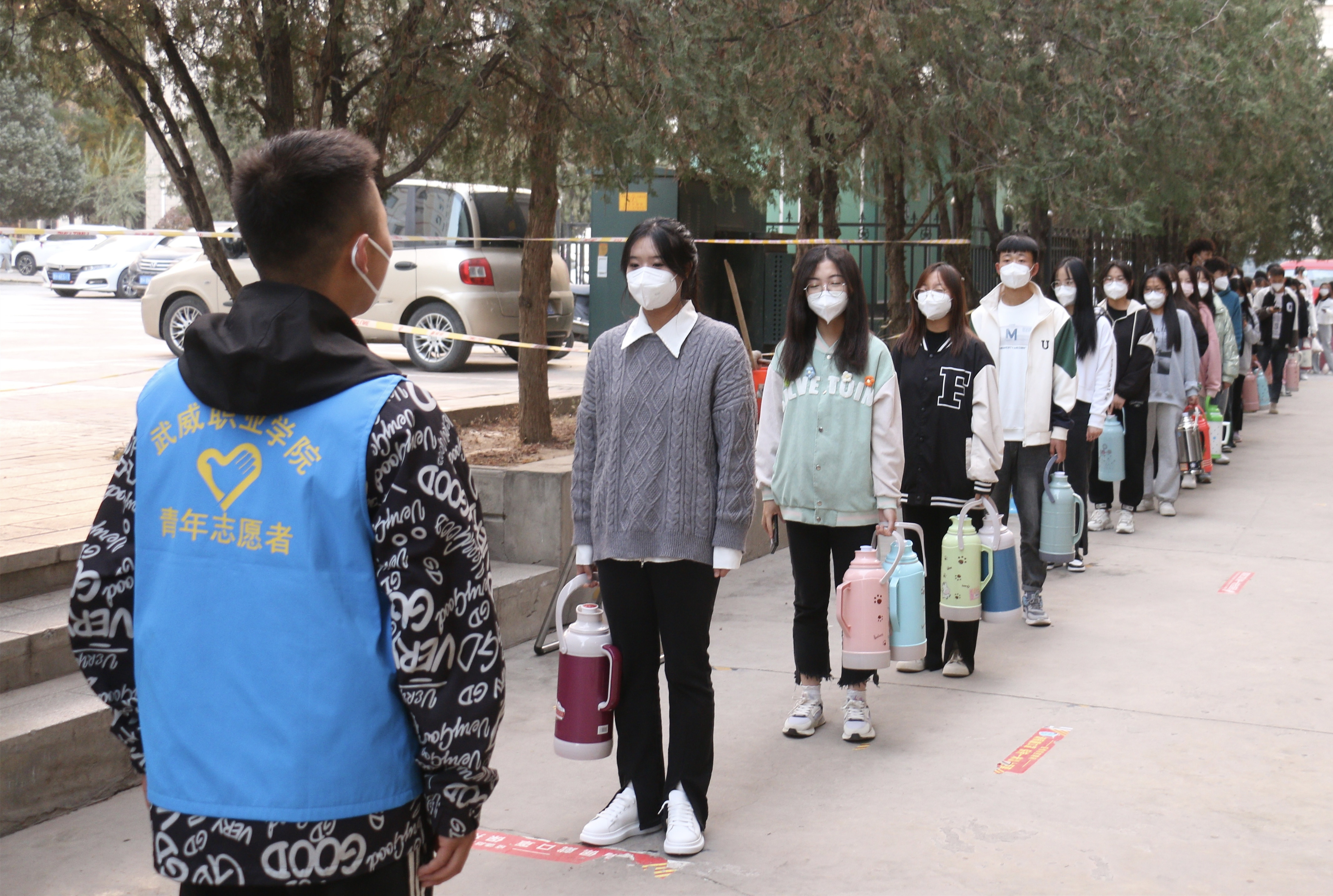 從學(xué)校實(shí)行最小單元宿舍管理開始,各學(xué)生組織工作人員分批次、不間斷、輪流值守,他們主動亮身份、帶頭當(dāng)先鋒,在校園食堂、水房、超市等人流容易聚集的地方,每天安排志愿者在人流高峰時間段排班站崗,勸導(dǎo)同學(xué)們遵守疫情防控一米線,不扎堆不聚集,積極佩戴好口罩,做好個人防護(hù)工作,確保同學(xué)們吃飯、購物、打水健康有序進(jìn)行。在對可能傳入疫情的校園圍欄處開展值守勸阻工作,積極勸導(dǎo)學(xué)生不購買社會面商品,堅決杜絕疫情從社會傳入校園,將學(xué)校疫情防控各項措施落細(xì)落實(shí),切實(shí)扛起校園疫情防控責(zé)任。一件件“藍(lán)馬甲”活躍在校園每個角落,服務(wù)同學(xué)的身影從未間斷,成為校園里一道靚麗的風(fēng)景線,用實(shí)際行動詮釋了新時代武職學(xué)子的責(zé)任與擔(dān)當(dāng)。