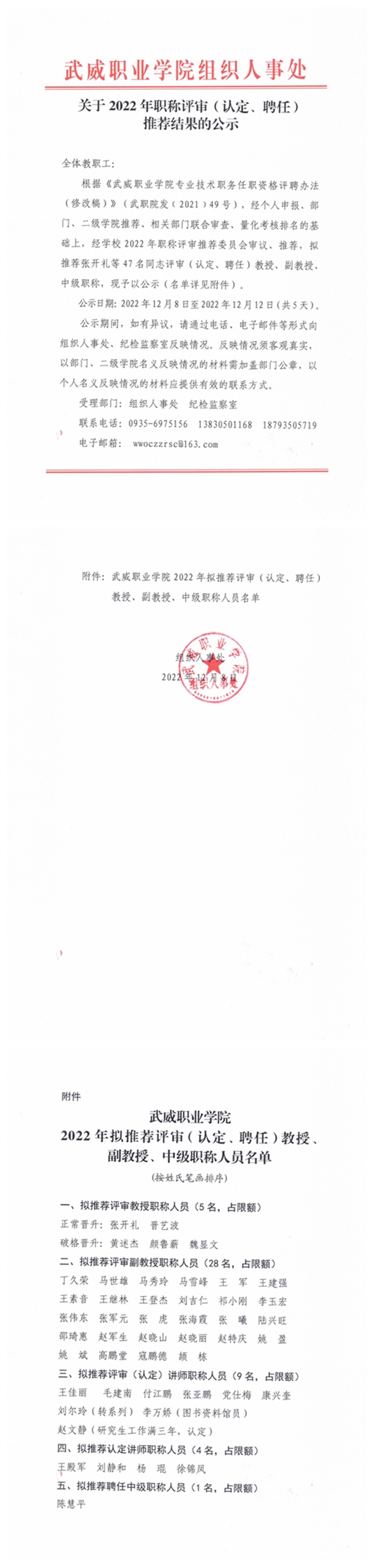 武威職業(yè)學(xué)院關(guān)于2022年教師副教授、講師職稱評(píng)審結(jié)果的公示