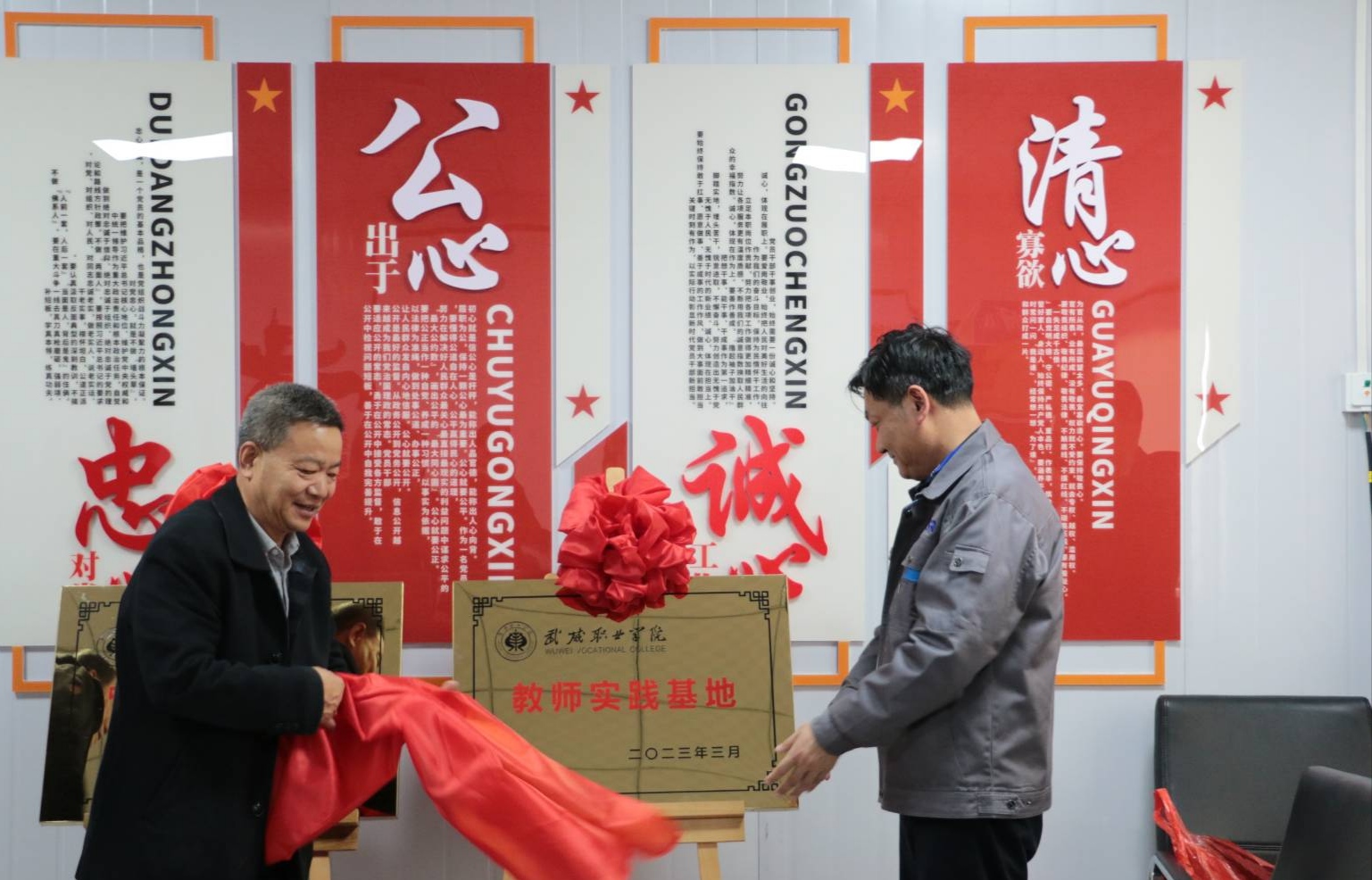 戴志敏和趙明為武威職業(yè)學(xué)院在應(yīng)物所武威園區(qū)的教師實(shí)踐基地和實(shí)訓(xùn)基地揭牌。