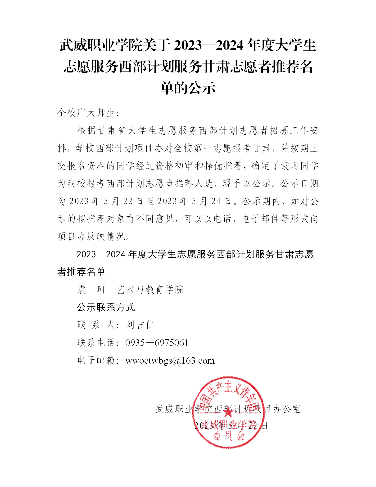 武威職業(yè)學(xué)院關(guān)于2023—2024年度大學(xué)生志愿服務(wù)西部計劃服務(wù)甘肅志愿者推薦名單的公示