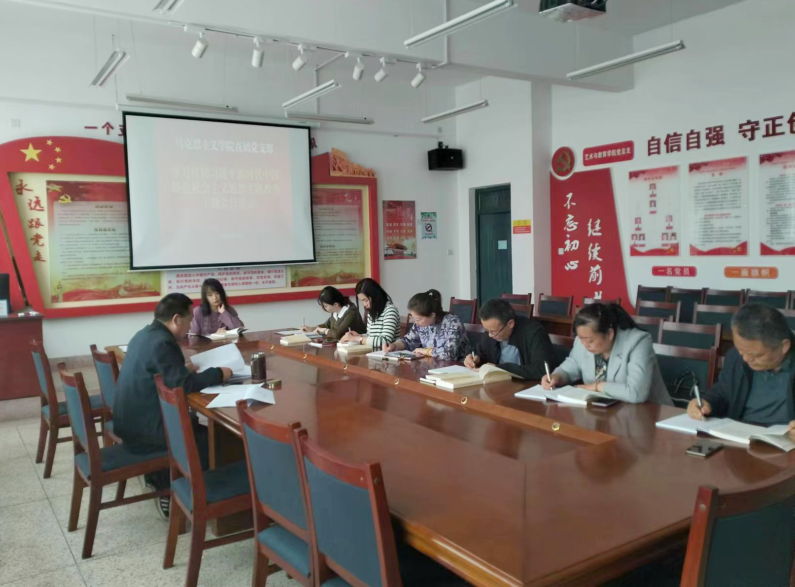 為進(jìn)一步推動(dòng)學(xué)習(xí)貫徹習(xí)近平新時(shí)代中國(guó)特色社會(huì)主義思想主題教育走深走實(shí),營(yíng)造良好的學(xué)習(xí)氛圍,近日,馬克思主義學(xué)院黨支部開展學(xué)習(xí)貫徹習(xí)近平新時(shí)代中國(guó)特色社會(huì)主義思想主題教育專題學(xué)習(xí)研討活動(dòng)?;顒?dòng)由支部書記劉心主持,支部全體黨員參加會(huì)議。