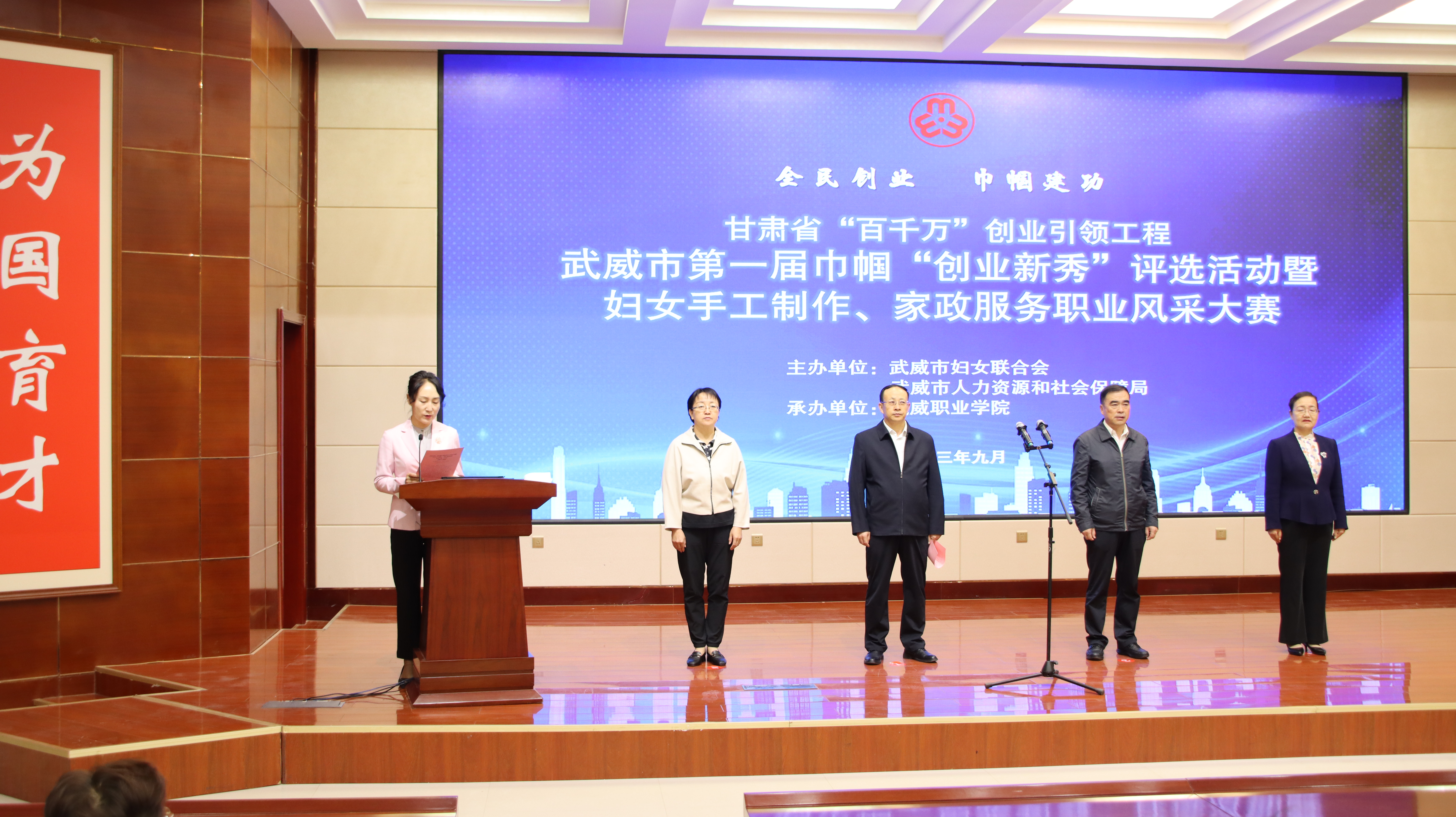 9 月 27 日,由市婦聯(lián)、市人社局主辦、我校承辦的甘肅省“百千萬(wàn)”創(chuàng)業(yè)引領(lǐng)工程武威市第一屆巾幗“創(chuàng)業(yè)新秀”評(píng)選活動(dòng)暨婦女手工制作、家政服務(wù)職業(yè)風(fēng)采大賽成功舉辦,武威市人社局黨組書(shū)記,局長(zhǎng)陳昱川,市婦聯(lián)黨組書(shū)記,主席劉玉華,武威市就業(yè)局局長(zhǎng)魏斌,武威市婦聯(lián)副主席張惠華,縣區(qū)婦聯(lián)負(fù)責(zé)同志,學(xué)校黨委委員,副校長(zhǎng)田迎春出席本次活動(dòng),參賽選手等100 人參加大賽。