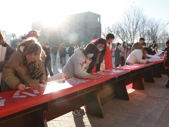 防艾知識宣傳志愿隊伍在大學(xué)生活動中心廣場發(fā)放宣傳手冊,制作并贈送紅絲帶標志400余個,活動中對300余名學(xué)生進行了免費艾滋病檢測。同學(xué)們一同在宣傳條幅上簽名,祝福語書滿了紅絲帶,一撇一捺、一筆一劃,都是無數(shù)的信念與期望的匯聚,是大家用無聲的行動承諾自己防艾的決心。