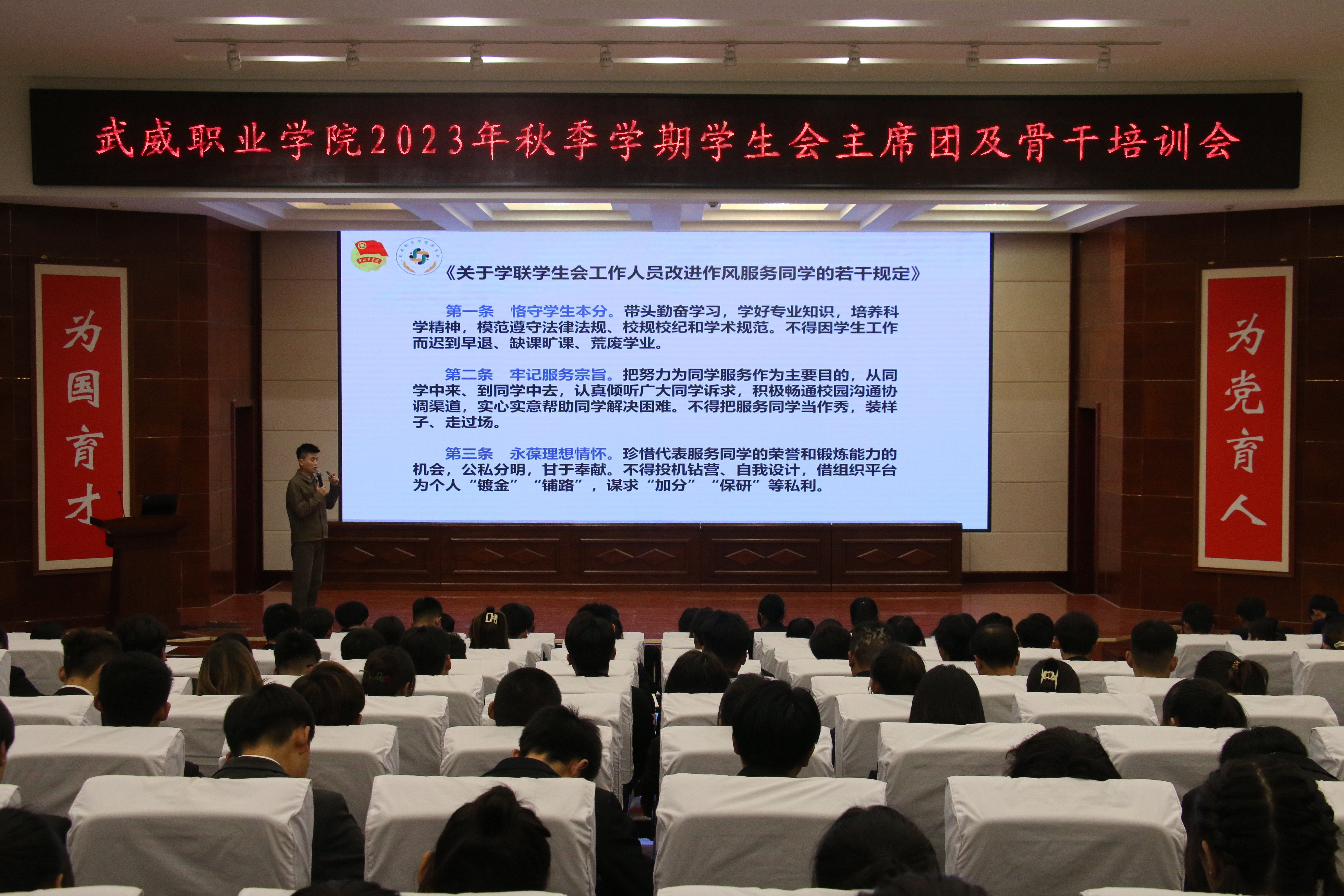 校學(xué)生會(huì)主席團(tuán)成員帶頭領(lǐng)學(xué)了《關(guān)于學(xué)聯(lián)學(xué)生會(huì)工作人員改進(jìn)作風(fēng)服務(wù)同學(xué)的若干規(guī)定》《武威職業(yè)學(xué)院學(xué)生會(huì)章程》等制度文件。學(xué)生會(huì)秘書(shū)長(zhǎng)張登海以《微光凝聚星海,筑夢(mèng)情懷方舟》為題,圍繞加強(qiáng)思想政治建設(shè)、深化學(xué)生會(huì)組織改革和進(jìn)一步加強(qiáng)從嚴(yán)治會(huì)等方面,為學(xué)生會(huì)組織成員展開(kāi)培訓(xùn)。