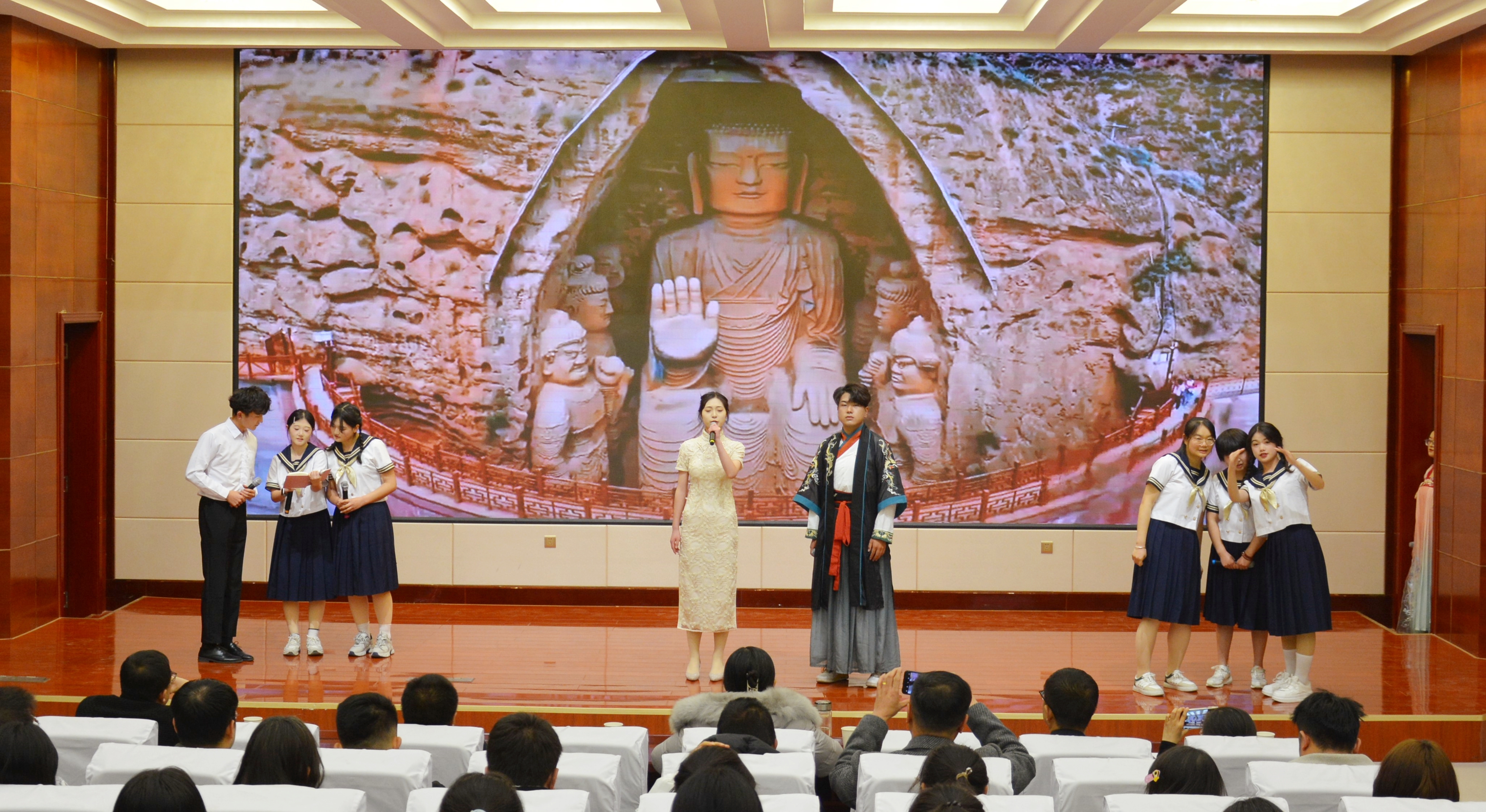 比賽現(xiàn)場精彩紛呈,現(xiàn)場氣氛異常熱烈,掌聲此起彼伏。節(jié)目以詩歌吟誦、伴舞、書法、國畫、武術(shù)、情景表演等豐富多彩的藝術(shù)形式,為現(xiàn)場觀眾打造出一場別開生面的涼州文化視聽盛宴。同學(xué)們激情洋溢,用澎湃真摯的情感演繹著經(jīng)典燦爛的磅礴詩篇,用跨越千年的對話勾勒出雄渾壯烈的漢武雄風(fēng),用鏗鏘有力的旋律編織出蕩氣回腸的時(shí)代頌歌,以青春奮斗的初心賡續(xù)著生生不息的五涼文化。