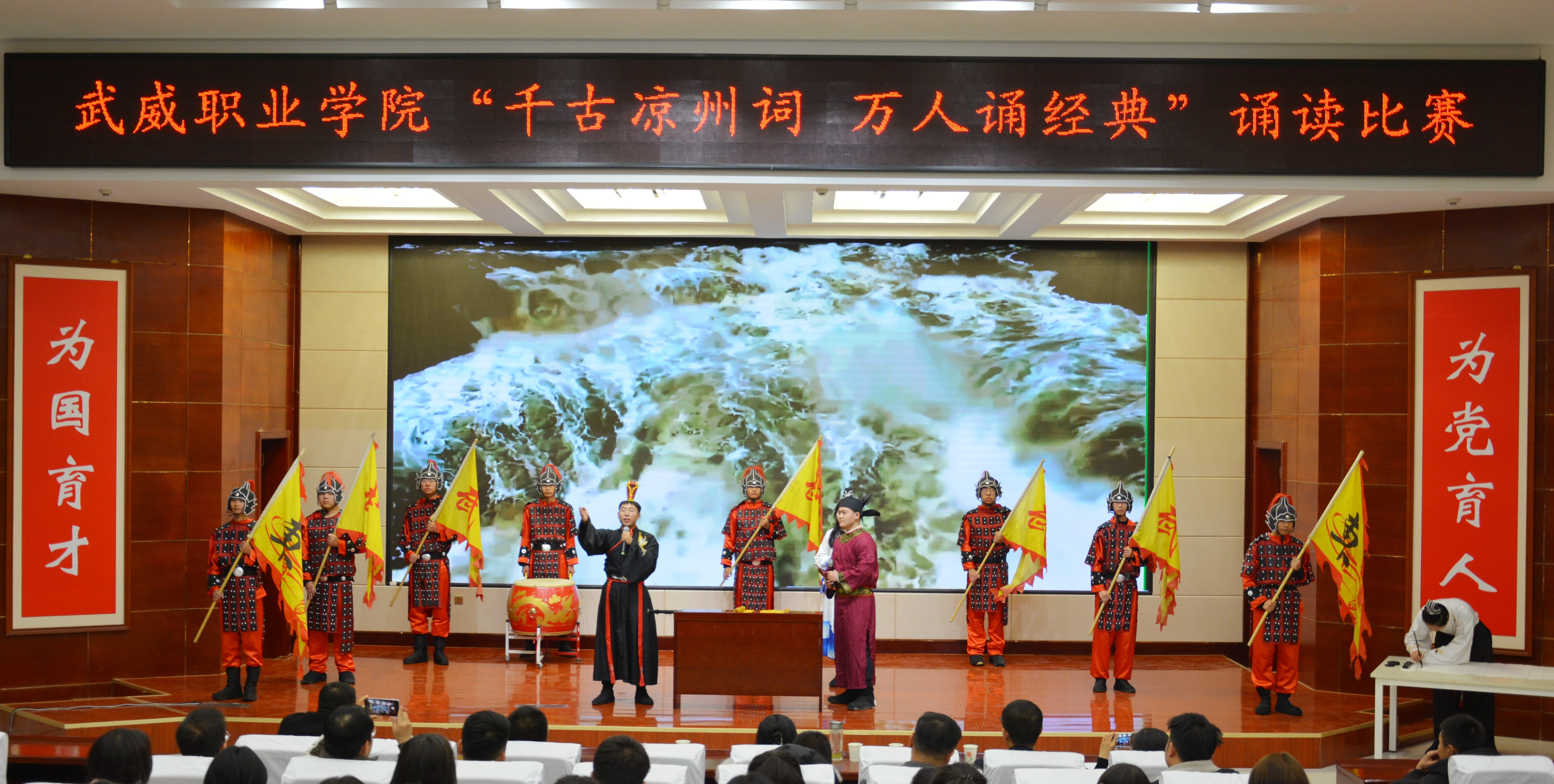 12月6日晚,學(xué)校“千古涼州詞 萬人誦經(jīng)典”誦讀比賽在菁英廳舉辦,學(xué)校校長、黨委副書記張開禮,黨委委員、副校長王守云出席活動(dòng),各二級學(xué)院團(tuán)委書記及學(xué)生代表220余人觀看比賽。