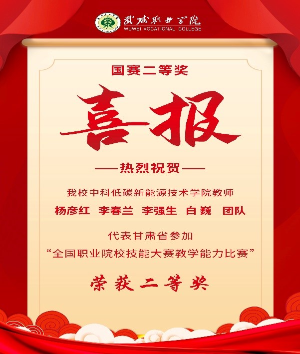 近日,2023年全國職業(yè)院校技能大賽教學能力比賽決賽在江西現(xiàn)代職業(yè)技術學院落下帷幕,由中科低碳新能源學院教師楊彥紅、李春蘭、李強生、白巍組成的參賽團隊作為甘肅省唯一一支打入國賽決賽的團隊,代表甘肅省參加比賽,喜獲專業(yè)課程高職一組二等獎。