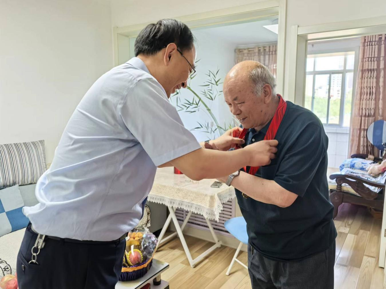 在擁有50年黨齡的退休教師秦光善家中,黨委書記王宏為他頒發(fā)了“光榮在黨50年”紀念章,并表達了深深的感謝,同時叮囑他要保重身體,遇到困難及時向組織反映。