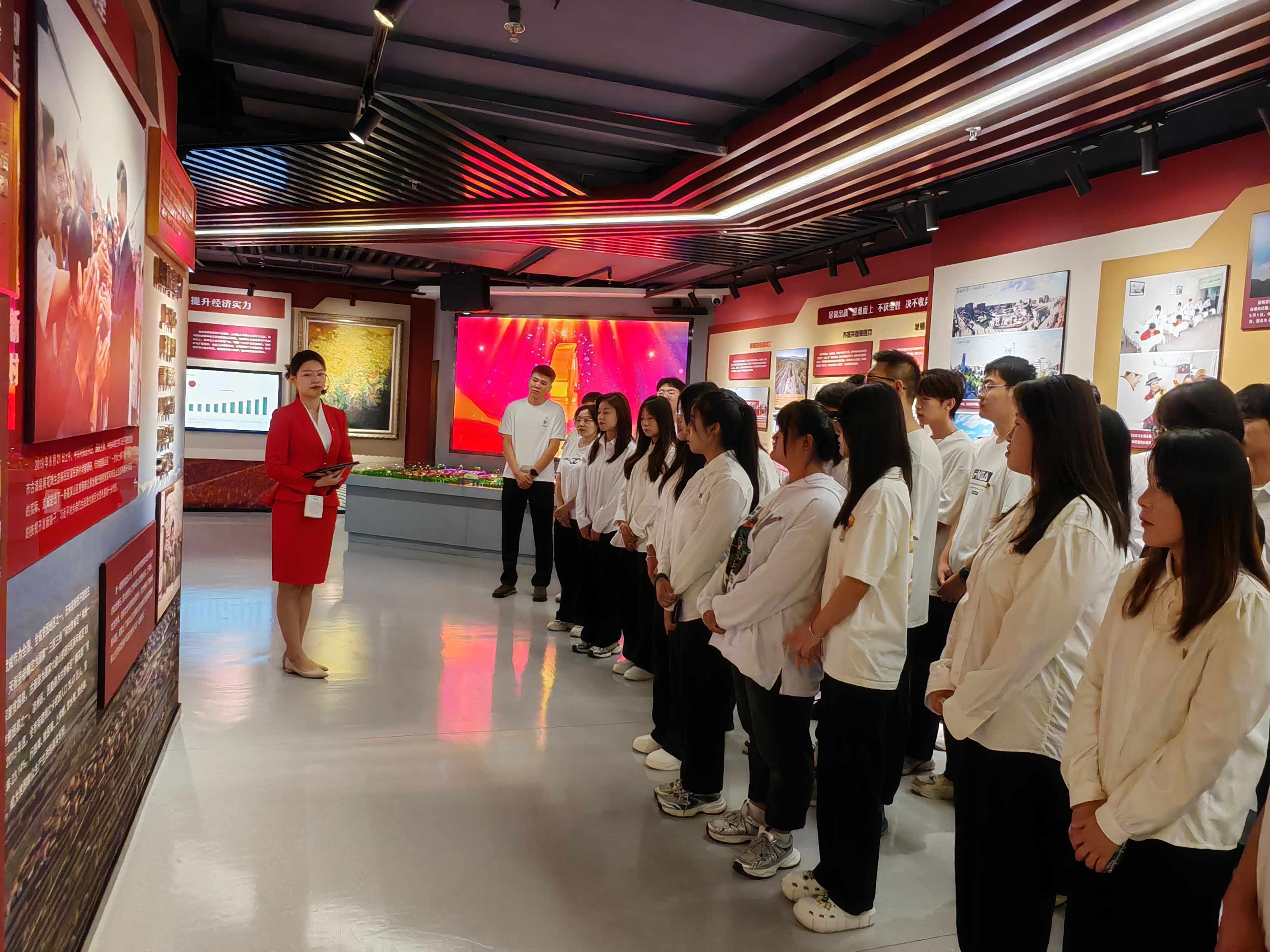 師生們在講解員的帶領下依次參觀了教育館的序廳、主廳、智慧黨建廳、紅色文創(chuàng)廳、尾廳以及初心講堂。每一個展廳都承載著豐富的歷史內涵,記錄了中國共產黨在不同歷史時期帶領人民取得的偉大成就。同學們認真聆聽講解員的解說,仔細觀看館內展出的珍貴圖片、文獻資料、歷史實物和視頻影像,全面了解了武威人民在黨的領導下,一步步克服困難、取得勝利的過程。隨后師生們觀看了紅色專題片《先鋒之光》。影片生動再現(xiàn)了無數(shù)革命先烈為了國家獨立、民族解放和人民幸福所付出的巨大犧牲與貢獻,從影片中汲取了愛國、拼搏、團結和克難的精神力量。