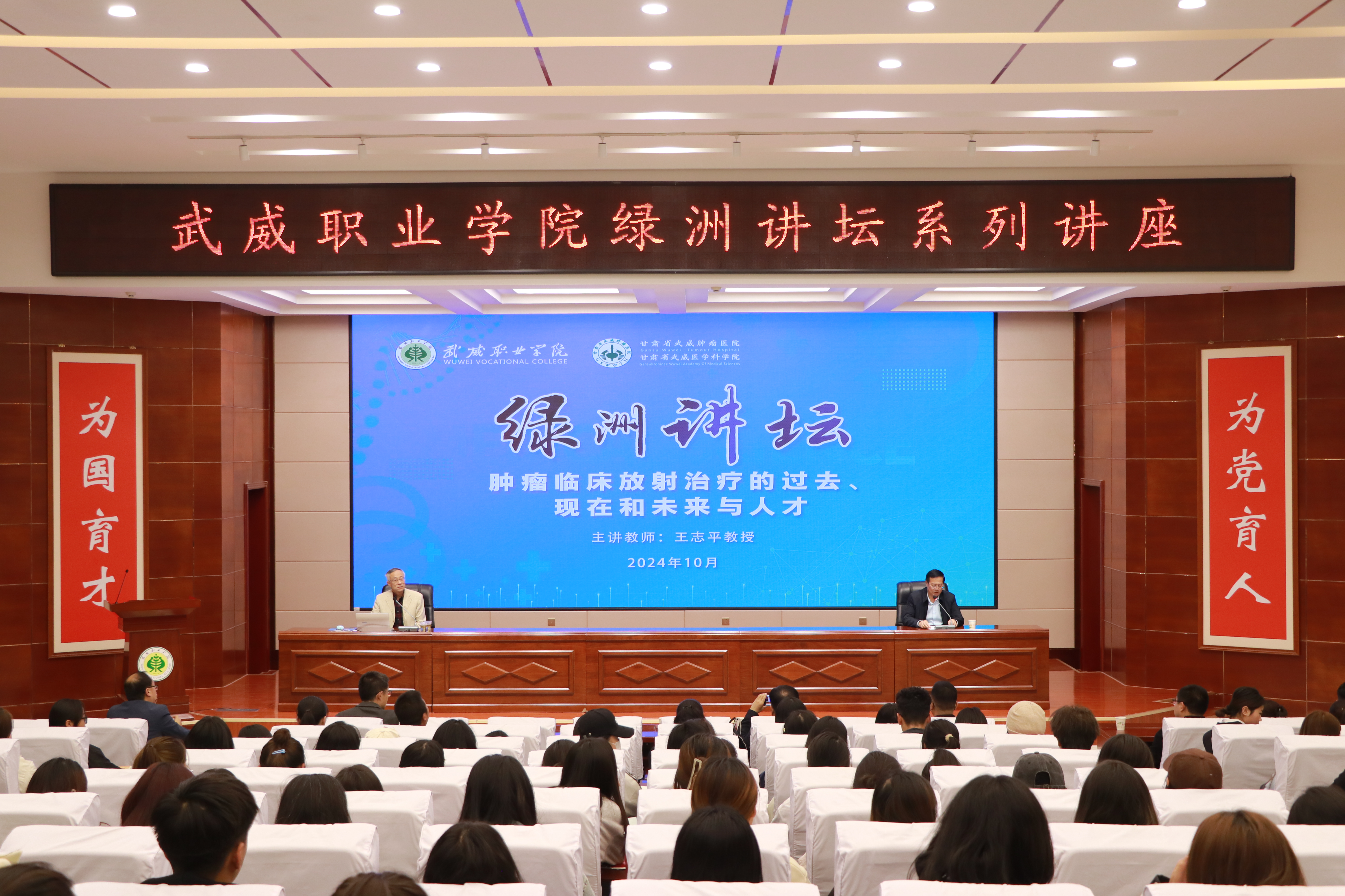 報(bào)告會(huì)由學(xué)校校長(zhǎng)、黨委副書(shū)記張開(kāi)禮主持,特邀蘭州大學(xué)第二醫(yī)院王志平教授作了“腫瘤臨床放射治療的過(guò)去、現(xiàn)在和未來(lái)與人才”的主題講座,甘肅省武威醫(yī)學(xué)科學(xué)院腫瘤醫(yī)院醫(yī)護(hù)人員代表、蘭州大學(xué)實(shí)習(xí)生代表和學(xué)校師生代表共計(jì)220余人參加了報(bào)告會(huì)。
