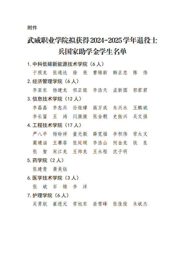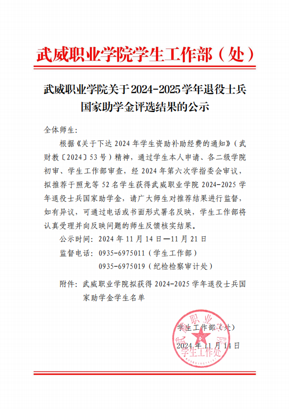2024-2025學年武威職業(yè)學院退役士兵國家助學金公示