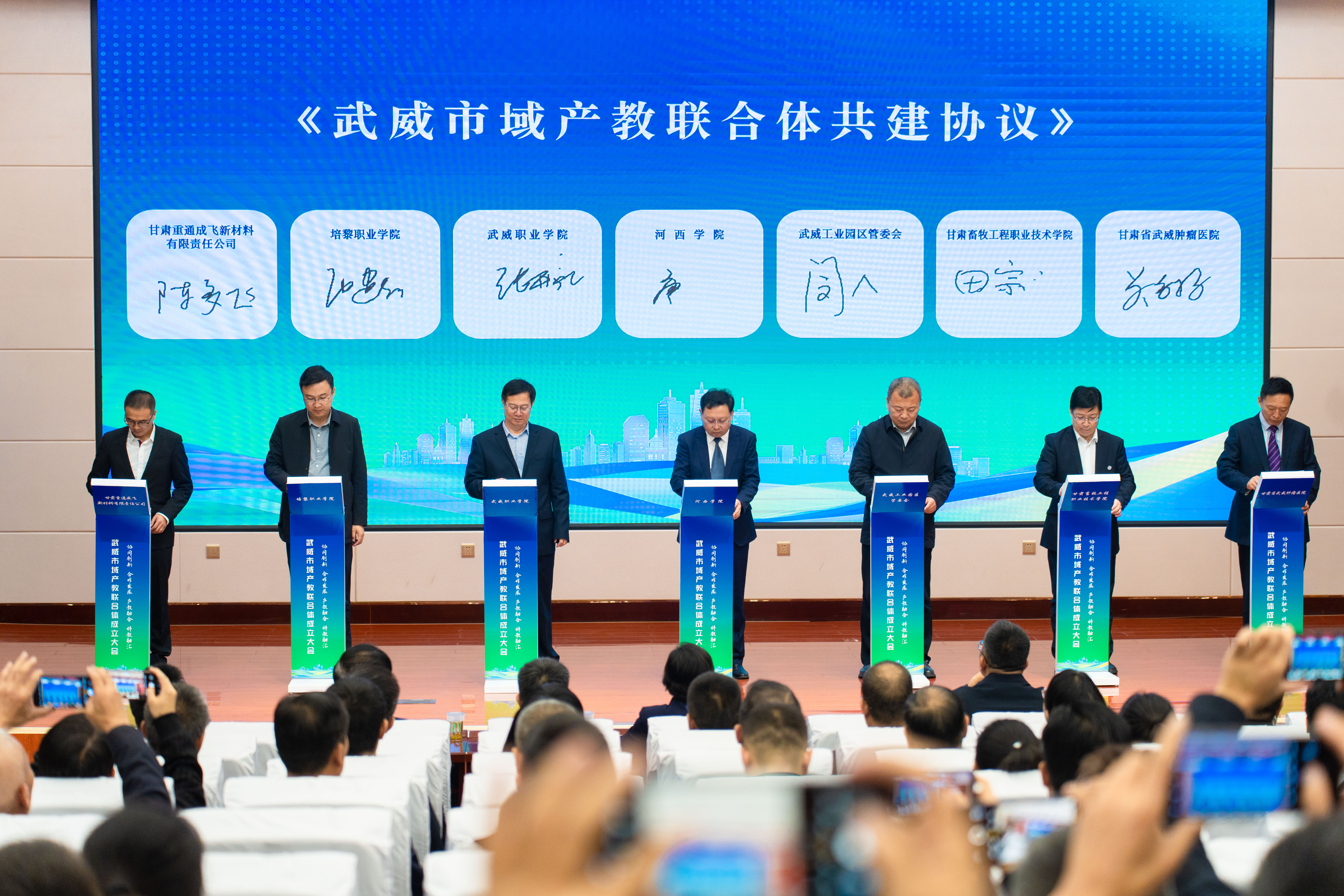 黨委書記王宏代表學(xué)校作為常務(wù)副理事長(zhǎng)單位在大會(huì)上致辭,校長(zhǎng)、黨委副書記張開禮與聯(lián)合體單位代表共同簽署《武威市域產(chǎn)教聯(lián)合體共建協(xié)議》。