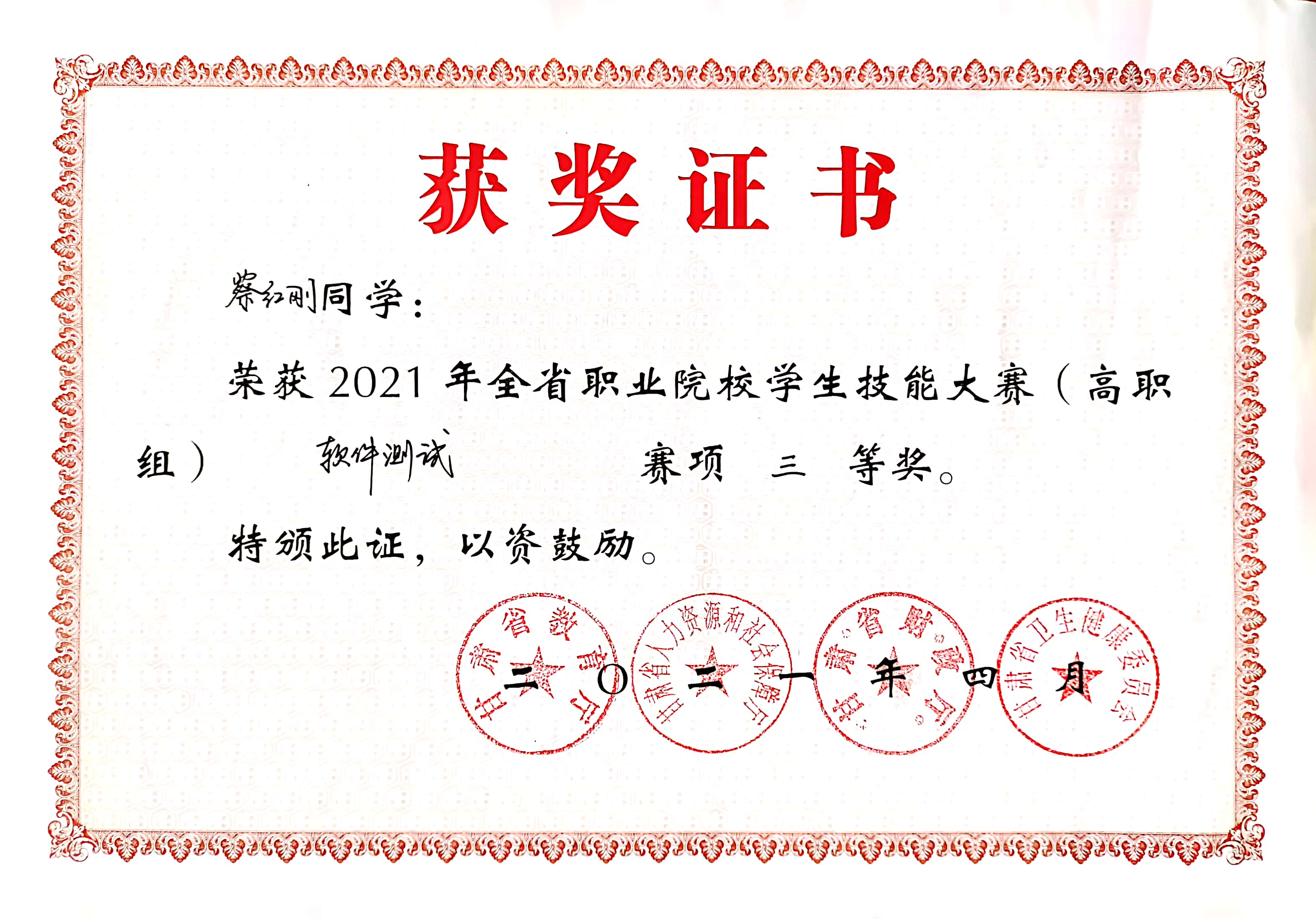 學(xué)生獲2021年全省職業(yè)院校學(xué)生技能大賽軟件測(cè)試三等獎(jiǎng)