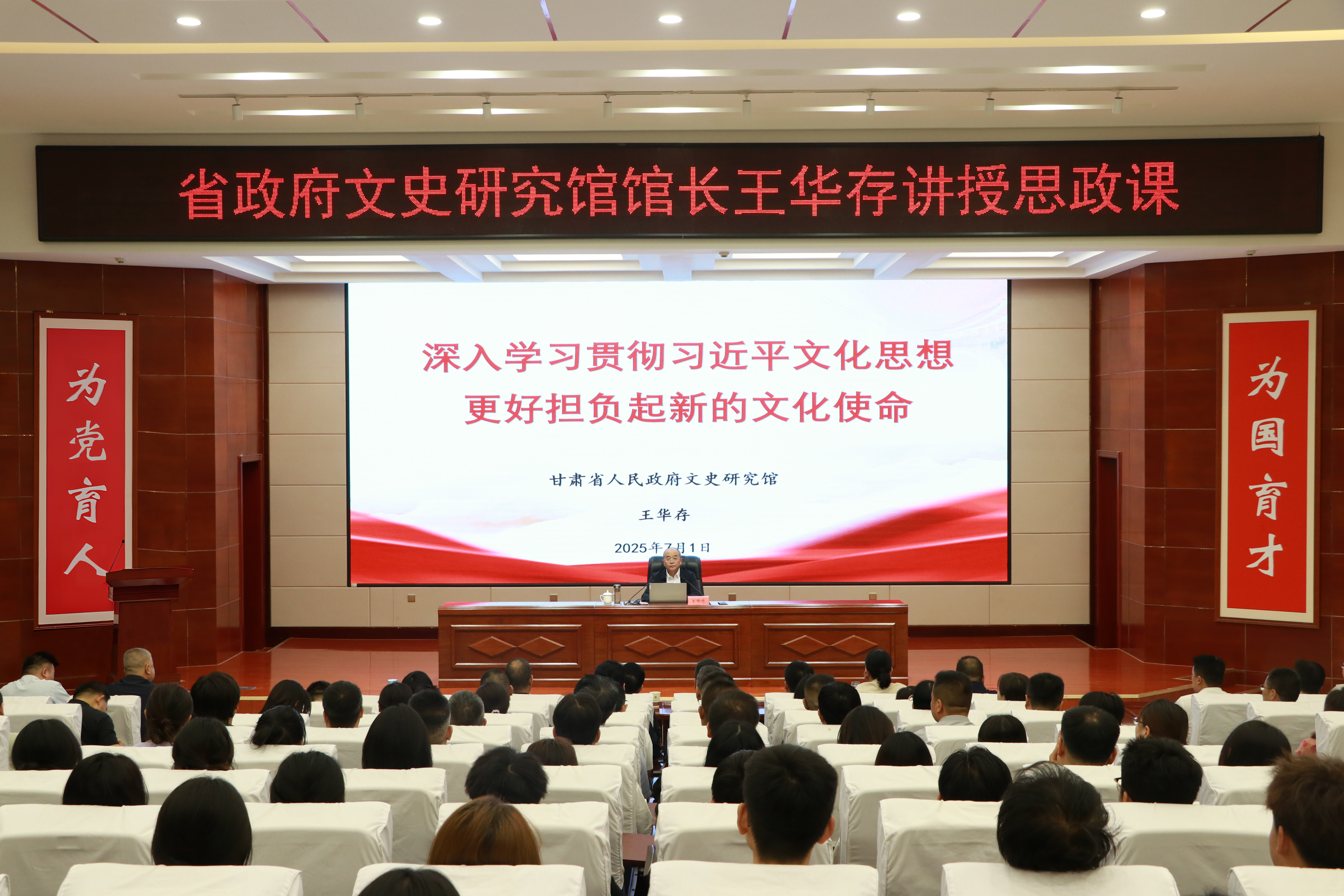 7月1日,在全校上下喜迎中國共產黨成立104周年之際,甘肅省人民政府文史研究館黨組書記、館長王華存到學校為師生講授思想政治理論課。王華存以“深入學習貫徹習近平文化思想 更好擔負起新的文化使命”為題,從深刻認識習近平文化思想的形成過程、習近平文化思想的豐富內涵和核心要義、甘肅文化歷史簡述、當代青年如何更好擔當起新的文化使命四個方面對習近平文化思想進行了全面解讀。黨委書記王宏主持,學校領導、中層管理干部及師生代表共200余人到場聆聽。
