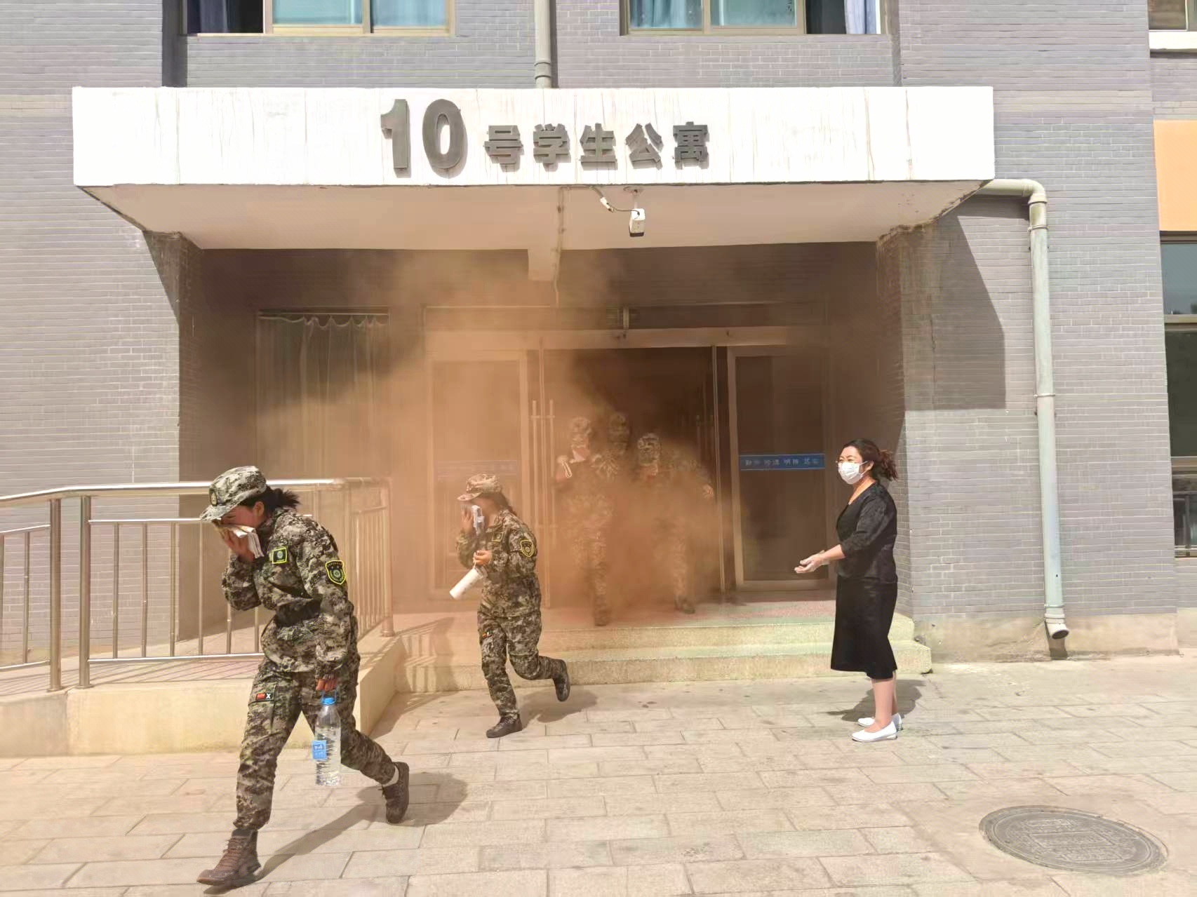 14時30分,疏散演練正式開始。隨著火災(zāi)警報響起,安全保衛(wèi)工作人員點燃煙餅,在學生公寓樓模擬火災(zāi)現(xiàn)場,冒出滾滾濃煙,公寓管理人員迅速組織學生有序疏散。在輔導員、班主任的引導下,同學們按照疏散要領(lǐng)和疏散路線,快速、有序地撤離至體育場。
