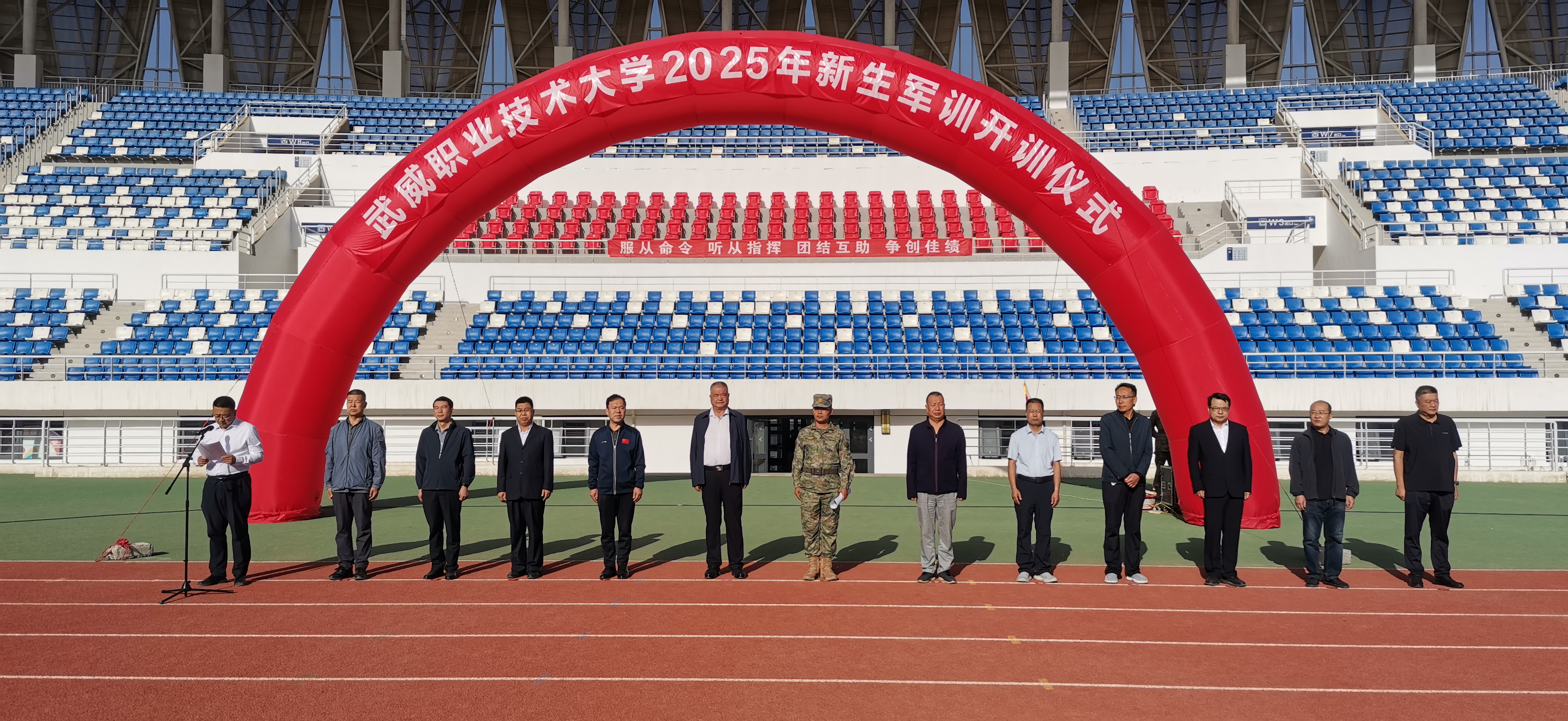 9月8日,武威職業(yè)技術大學2025級新生軍訓開訓動員大會在學校體育場舉行。全體新同學整齊列隊,以飽滿的精神狀態(tài)迎接大學的重要一課。學校黨委委員、副校長王守云,軍訓總教官翟波濤中校以及各二級學院負責同志、承訓部隊教官、教師代表和2025級全體新生參加大會。大會由學生工作部負責人張世亮主持。