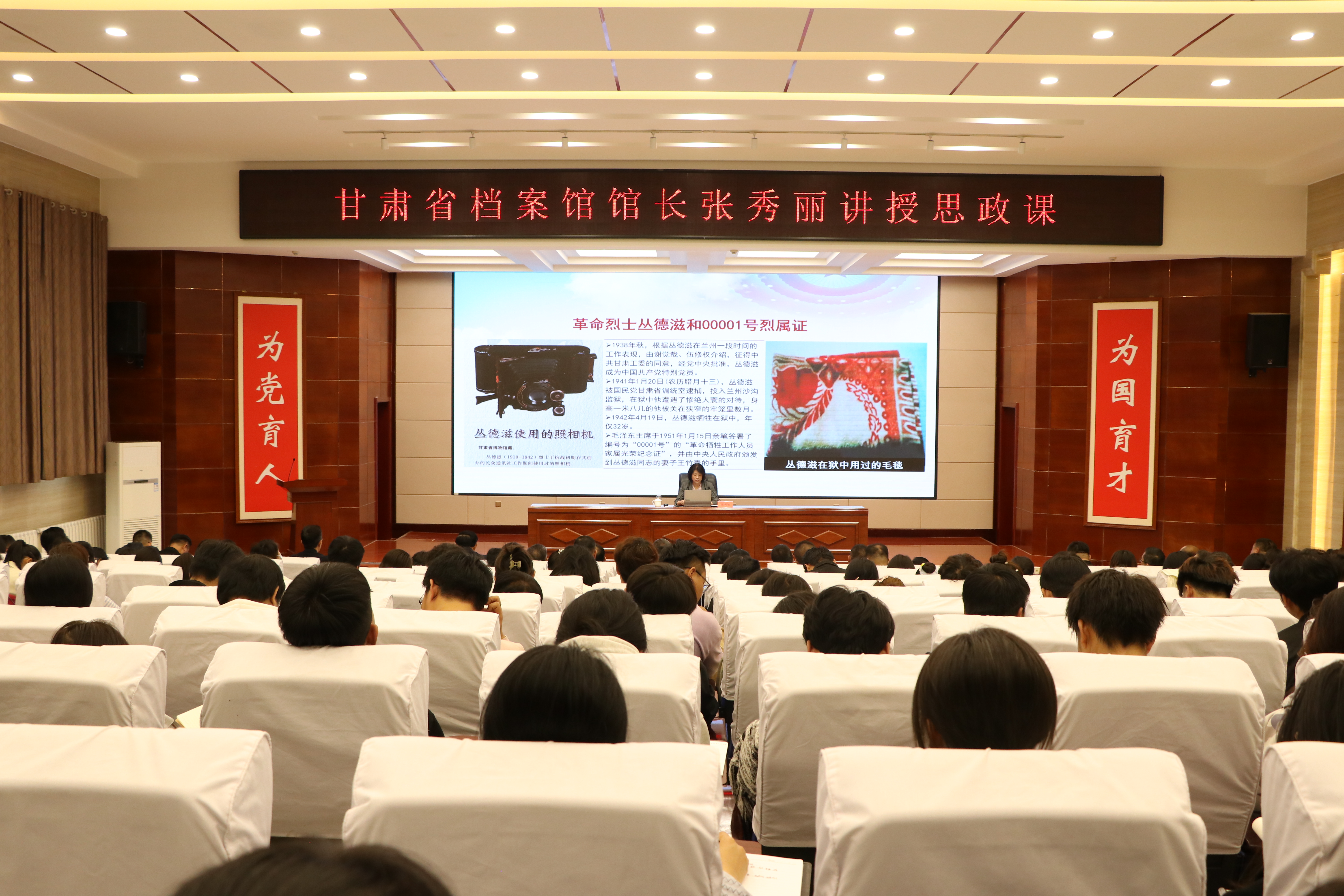 張秀麗結(jié)合自身從事檔案管理和文化研究的豐富經(jīng)驗(yàn),從檔案“存史、資政、育人”根本任務(wù)出發(fā),通過大量珍貴檔案文獻(xiàn)和歷史案例,系統(tǒng)闡述了檔案在記錄民族苦難輝煌、服務(wù)當(dāng)代治國理政、培育時(shí)代新人中的重要作用。報(bào)告中,她以館藏漢代簡牘、革命烈士叢德滋00001號(hào)烈屬證、民勤治沙檔案、甘肅地震檔案等一批具有歷史代表性和地域特色的檔案為載體,帶領(lǐng)師生穿越時(shí)空,感受中華民族生生不息的精神力量,深刻解讀“勿忘昨天的苦難輝煌,無愧今天的使命擔(dān)當(dāng),不負(fù)明天的偉大夢(mèng)想”的時(shí)代內(nèi)涵。