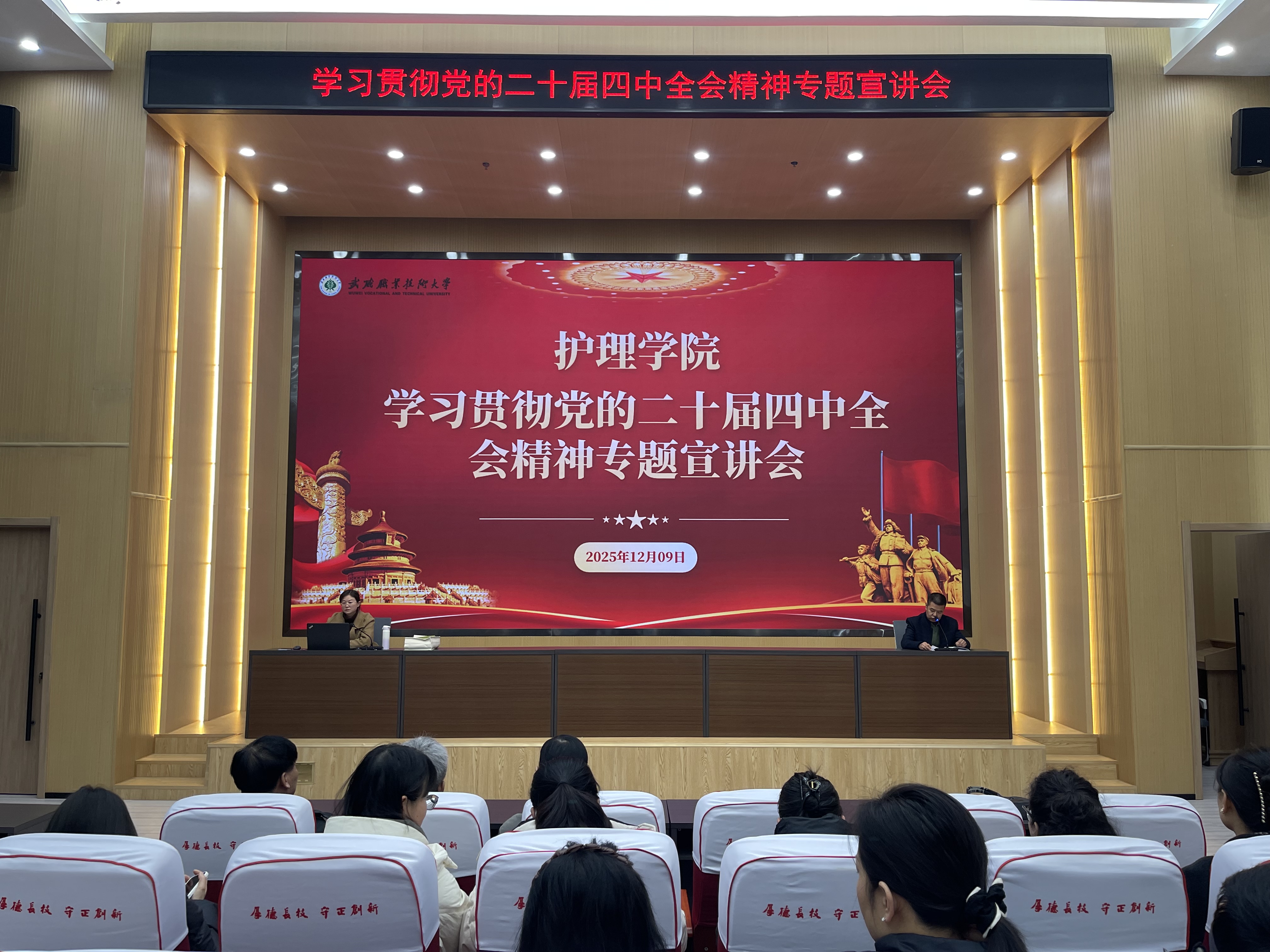 為深入學(xué)習(xí)宣傳貫徹黨的二十屆四中全會精神,切實(shí)把思想和行動統(tǒng)一到黨中央決策部署上來,根據(jù)學(xué)校黨委統(tǒng)一安排,12月9日,護(hù)理學(xué)院舉行了學(xué)習(xí)宣傳貫徹黨的二十屆四中全會精神專題宣講報告會。學(xué)校宣講組成員、馬克思主義學(xué)院教師杜曉娟應(yīng)邀做專題宣講。學(xué)院領(lǐng)導(dǎo)班子、全體教職工、預(yù)備黨員、入黨積極分子及班團(tuán)干部共計100余人聆聽了報告會。報告會由學(xué)院黨總支書記藺生武主持。