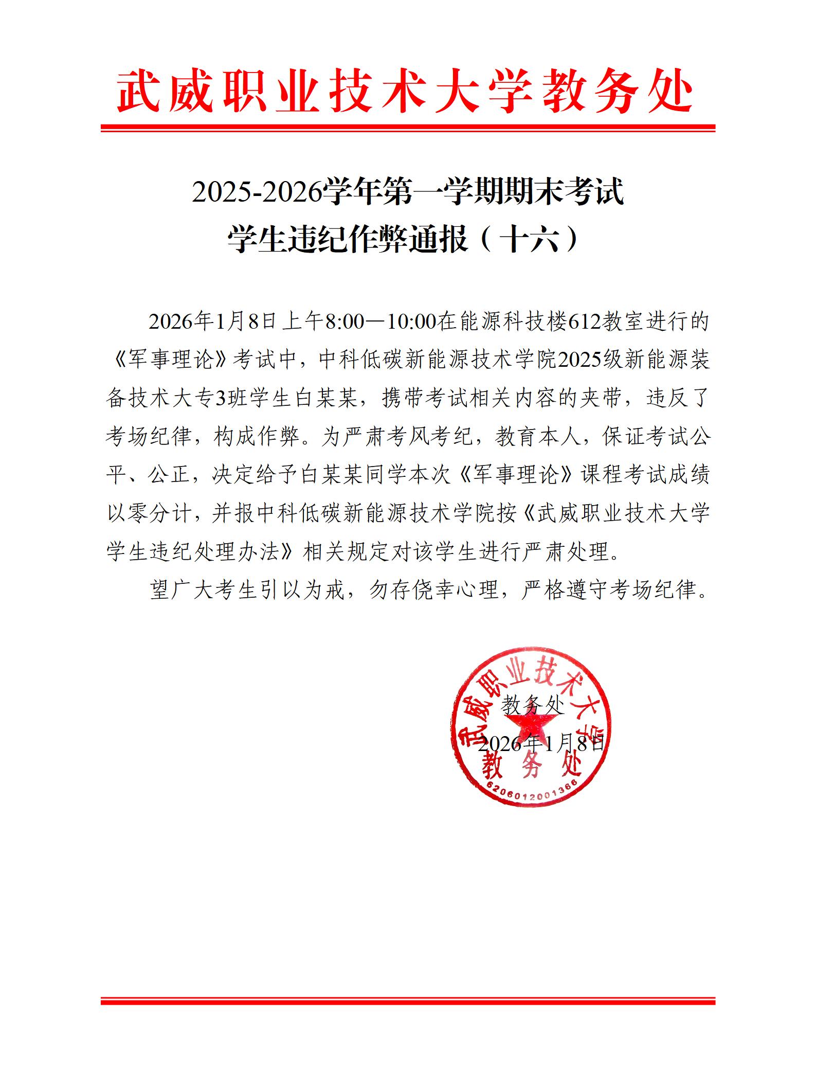 2025-2026學(xué)年第一學(xué)期期末考試學(xué)生違紀(jì)作弊通報(bào)(十六)
