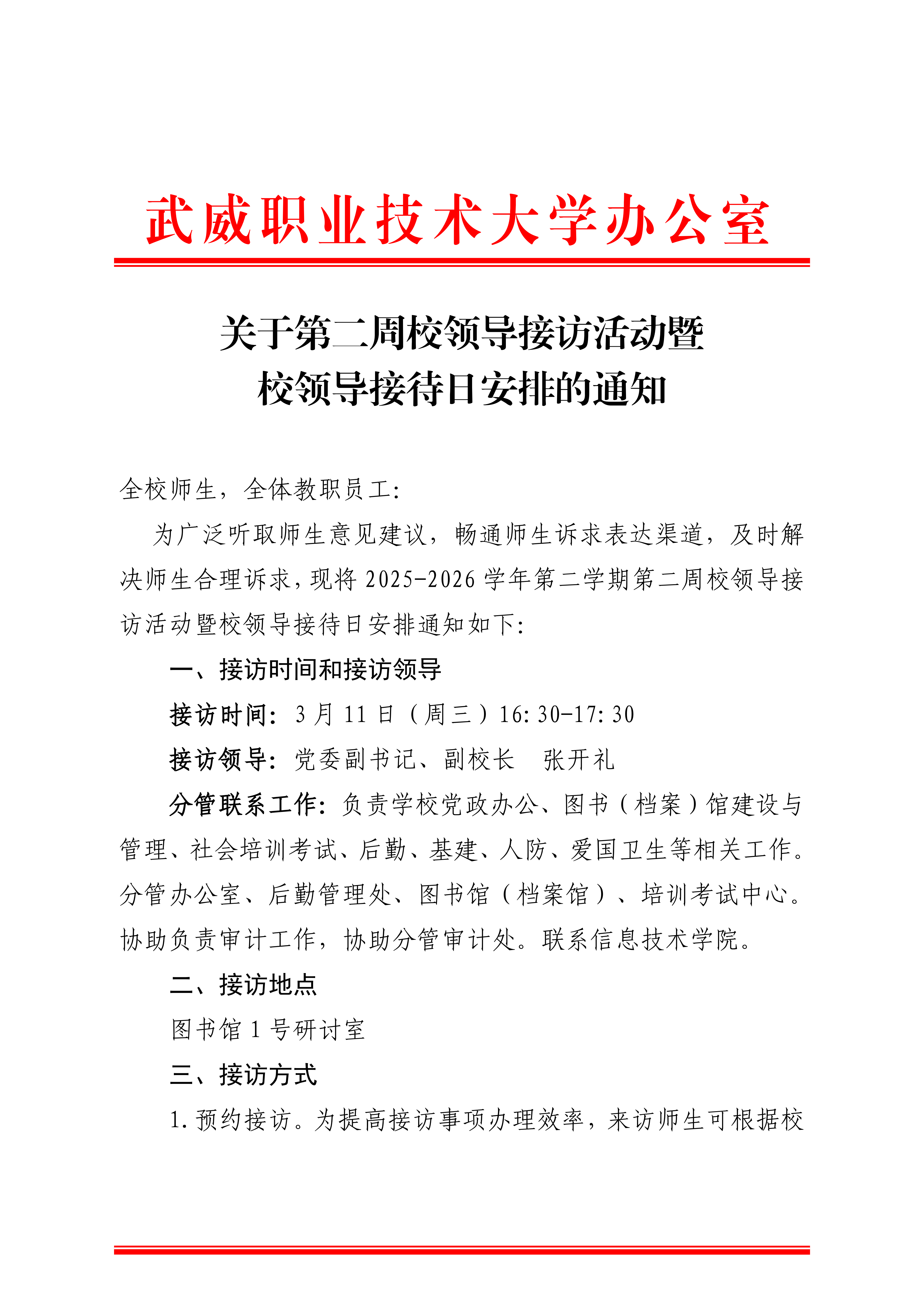 關(guān)于2025-2026學(xué)年第二學(xué)期第二周校領(lǐng)導(dǎo)接待日安排的通知