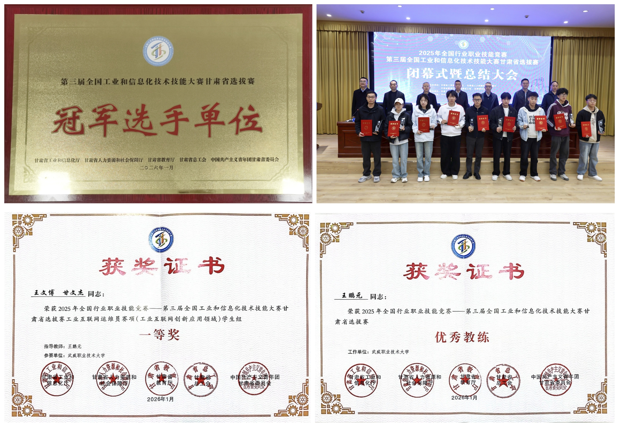 近日,2025年全國行業(yè)職業(yè)技能競賽——第三屆全國工業(yè)和信息化技術(shù)技能大賽甘肅省選拔賽在甘肅工業(yè)職業(yè)技術(shù)大學順利閉幕。我校信息技術(shù)學院參賽選手王文博、甘文杰憑借其扎實的專業(yè)基礎(chǔ)、精湛的操作技藝與穩(wěn)健的臨場表現(xiàn),在激烈競爭中脫穎而出,榮獲大賽一等獎,我校被授予“冠軍選手單位”榮譽稱號。