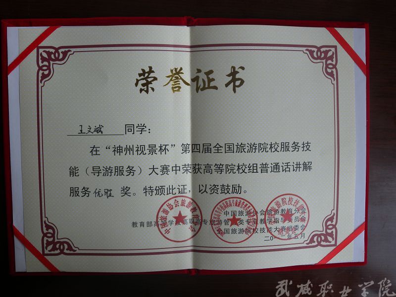 經濟管理系晉藝波老師指導我系旅游管理、酒店管理專業(yè)學生參加2012年“神州視景杯”第四屆全國旅游院校服務技能(導游技能)大賽,榮獲優(yōu)秀獎。