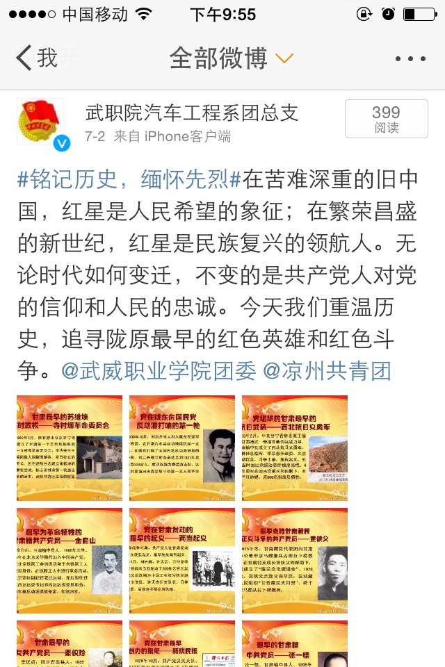 新媒體是對(duì)團(tuán)員青年進(jìn)行宣傳教育的一塊重要的輿論陣地,汽車工程系團(tuán)總支通過青媒中心設(shè)立的微信公眾平臺(tái)、新浪微博、QQ空間等多種手段,通過發(fā)布中國人民抗戰(zhàn)歷史知識(shí)、設(shè)立紀(jì)念抗日戰(zhàn)爭70周年話題等多種形式,以圖文并茂的方式給團(tuán)員青年進(jìn)行了一次中國人民抗戰(zhàn)大普及和大討論,使團(tuán)員青年在學(xué)習(xí)知識(shí)和討論觀點(diǎn)中,堅(jiān)定理想信念,培養(yǎng)愛國情操、樹立歷史使命、珍惜美好生活、勿忘國恥,展望未來。