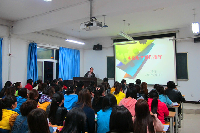 系主任晏素珍對本次畢業(yè)生畢業(yè)論文(設(shè)計)做了三點要求,一是全體畢業(yè)生要高度重視畢業(yè)論文(設(shè)計)的寫作;二是嚴(yán)格按照指導(dǎo)教師的要求保質(zhì)保量的完成論文;三是每位指導(dǎo)老師對論文指導(dǎo)工作要認(rèn)真負(fù)責(zé)、耐心細(xì)致。蔡海老師做了題為《畢業(yè)生論文寫作指導(dǎo)》的報告,主要從論文格式要求、文獻(xiàn)查詢方法、論文寫作方法三個方面給同學(xué)們做了深入淺出的講解,受到同學(xué)們的熱烈歡迎。
