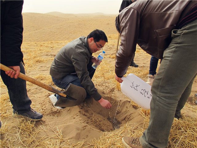 到達(dá)治沙造林現(xiàn)場后,師生按照劃分好的區(qū)域,帶上塑料桶,拿上土鉆,馬上投入到了緊張的勞動中。在現(xiàn)場技術(shù)人員的指導(dǎo)下挖坑、栽種樹苗、澆水,完成了預(yù)定的治沙造林任務(wù)。