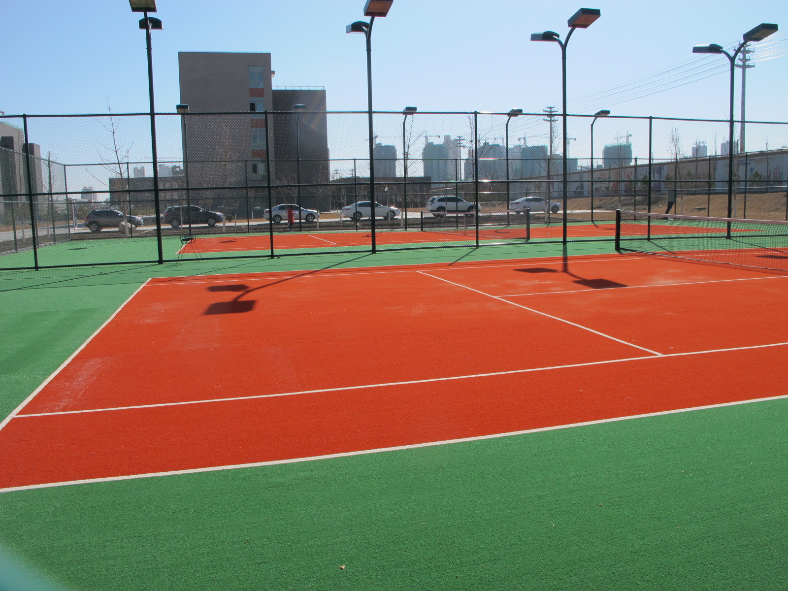 學(xué)院網(wǎng)球場(chǎng)采用標(biāo)準(zhǔn)尺寸設(shè)計(jì),包括兩個(gè)標(biāo)準(zhǔn)場(chǎng)地。外鋪設(shè)彩色散水磚,內(nèi)鋪設(shè)人工草坪和塑膠場(chǎng)。其中每個(gè)網(wǎng)球場(chǎng)南北長(zhǎng)36.6米,東西寬18.3米。施工包括彈性球場(chǎng)基礎(chǔ)工程,彈性球場(chǎng)面層工程,網(wǎng)球場(chǎng)圍網(wǎng)、攔網(wǎng)及網(wǎng)球場(chǎng)照明工程組成。