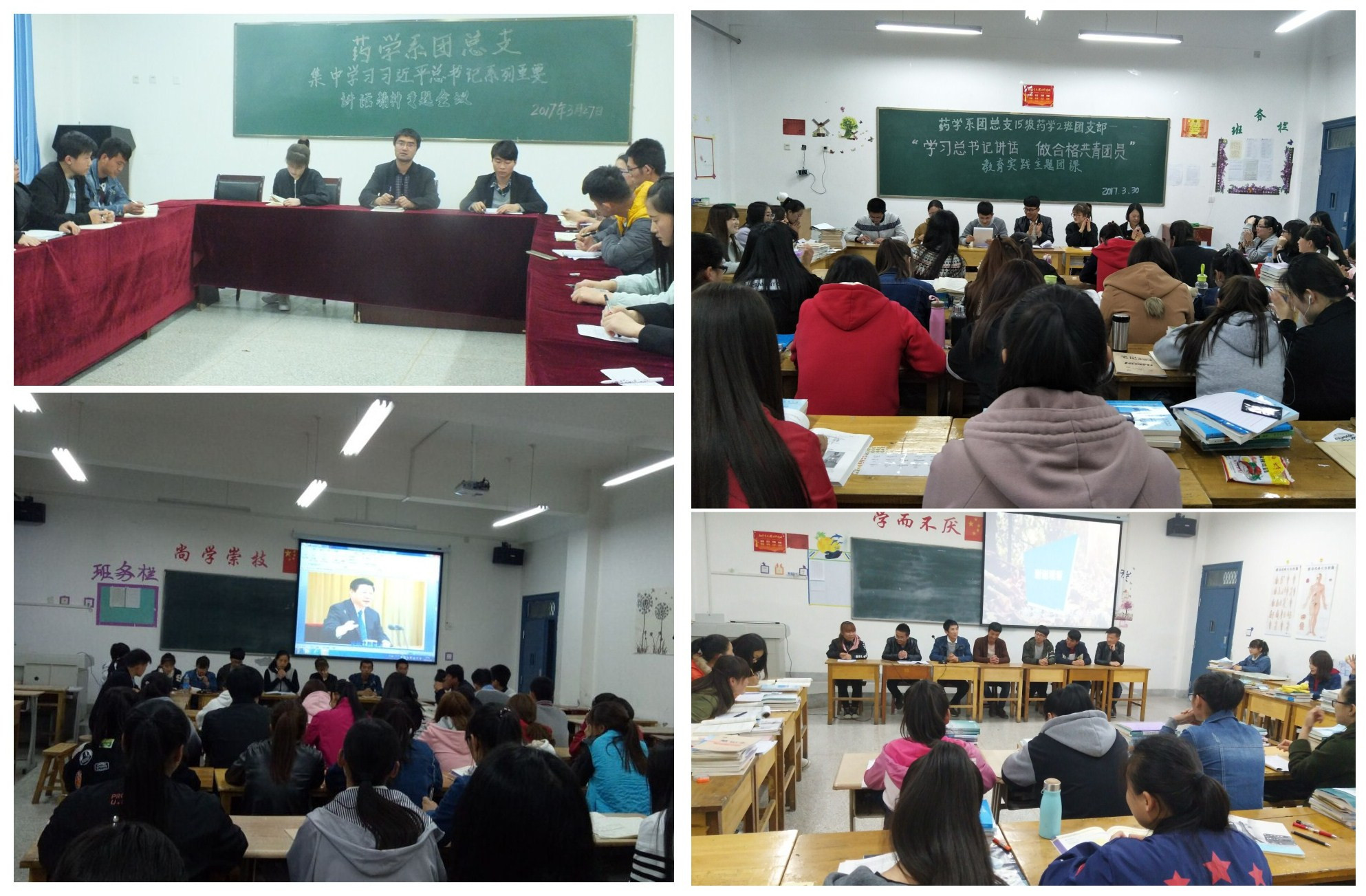 3月27至3月31日,藥學系團總支在系黨總支的周密安排和精心指導下,結(jié)合院團委開展“一學一做”教育實踐的總體部署,組織各班團支部在明遠樓各班教室集中開展了學習 “習近平總書記在中國科學技術(shù)大學視察和在知識分子、勞動模范、青年代表座談會上重要講話精神”,并觀看相關(guān)教育視頻。視頻中,習近平總書記向廣大青年寄予厚望,專門對大學生提出了“做有理想、有追求的大學生,做有擔當、有作為的大學生,做有品質(zhì)、有修養(yǎng)的大學生”的明確要求,并勉勵廣大青年“踏踏實實做事,踏踏實實做人”。
