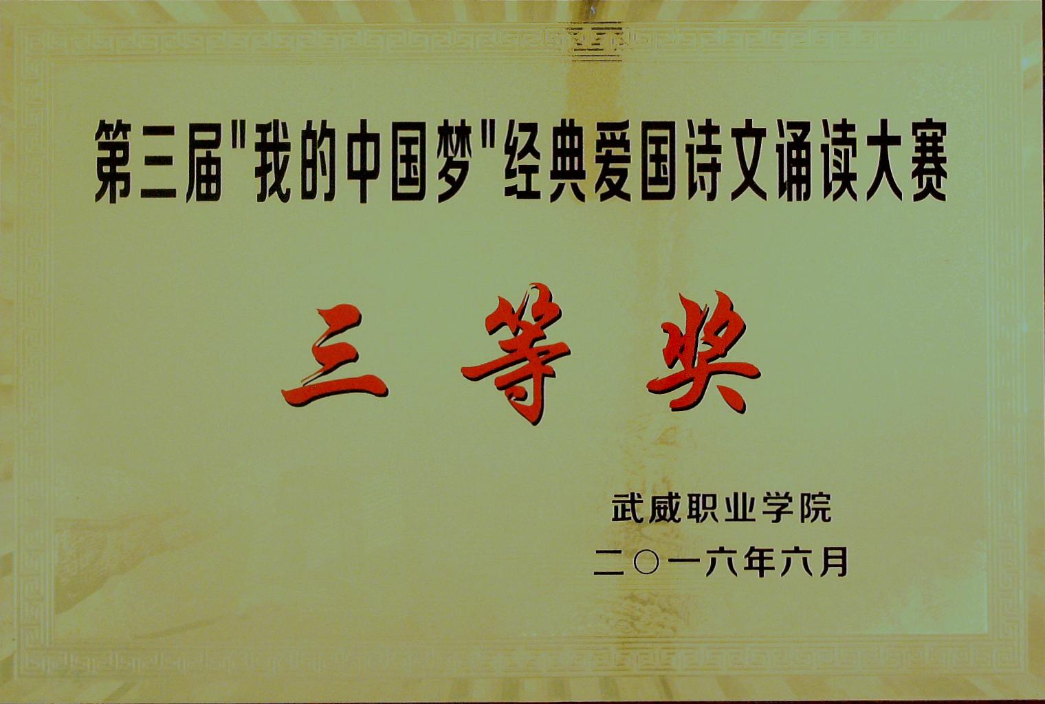 第三屆“我的中國夢”經(jīng)典愛國詩文誦讀大賽三等獎(jiǎng)