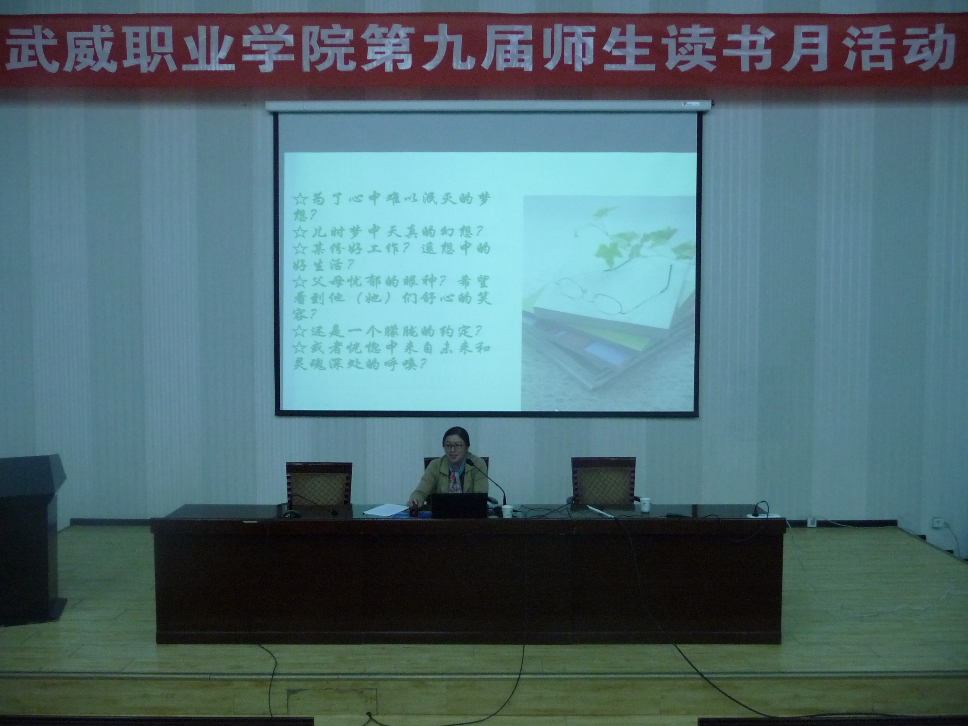 為在全院師生中營造良好的讀書氛圍,豐富校園文化生活,在第22個世界讀書日來臨之際,4月20日,武威職業(yè)學(xué)院第九屆讀書月活動專題講座在正德廳舉行。學(xué)院中文專業(yè)副教授、電子信息工程系主任李亞梅應(yīng)邀進行了《為何而讀書》的專題講座,近300名師生參加了此次講座。