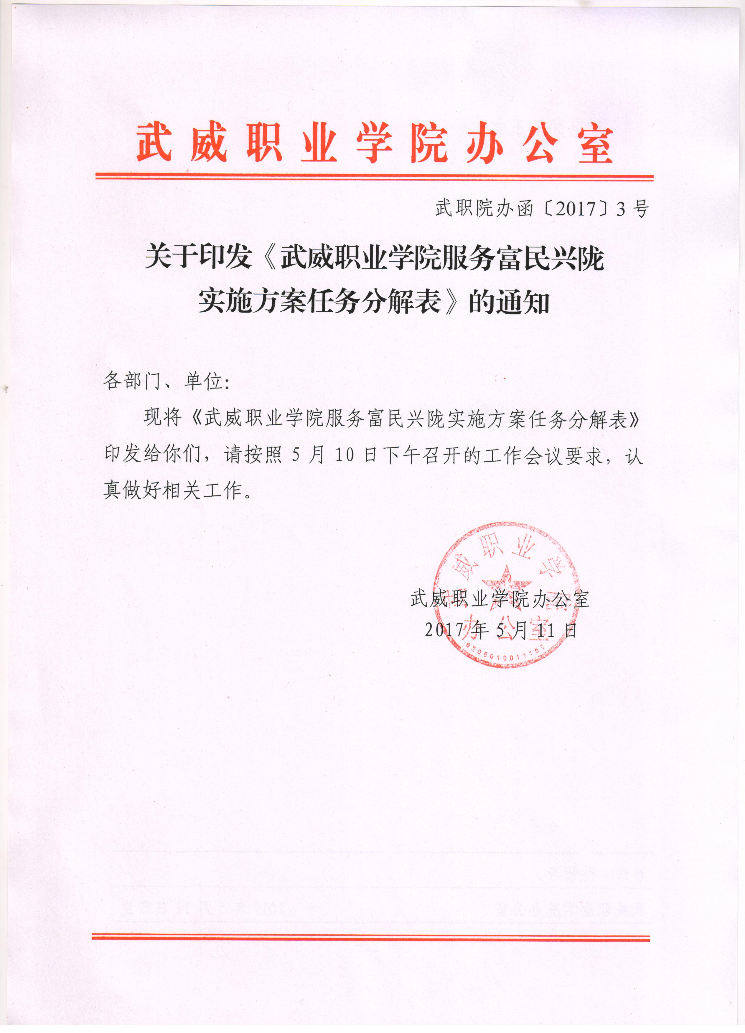 關(guān)于印發(fā)《武威職業(yè)學(xué)院服務(wù)富民興隴實(shí)施方案任務(wù)分解表》的通知