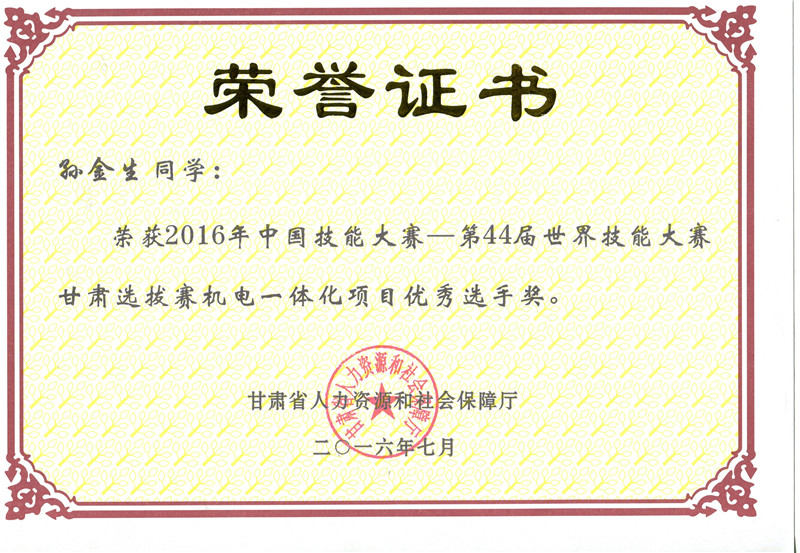 2016年中國(guó)技能大賽甘肅選拔賽機(jī)電一體化技術(shù)項(xiàng)目?jī)?yōu)秀獎(jiǎng)