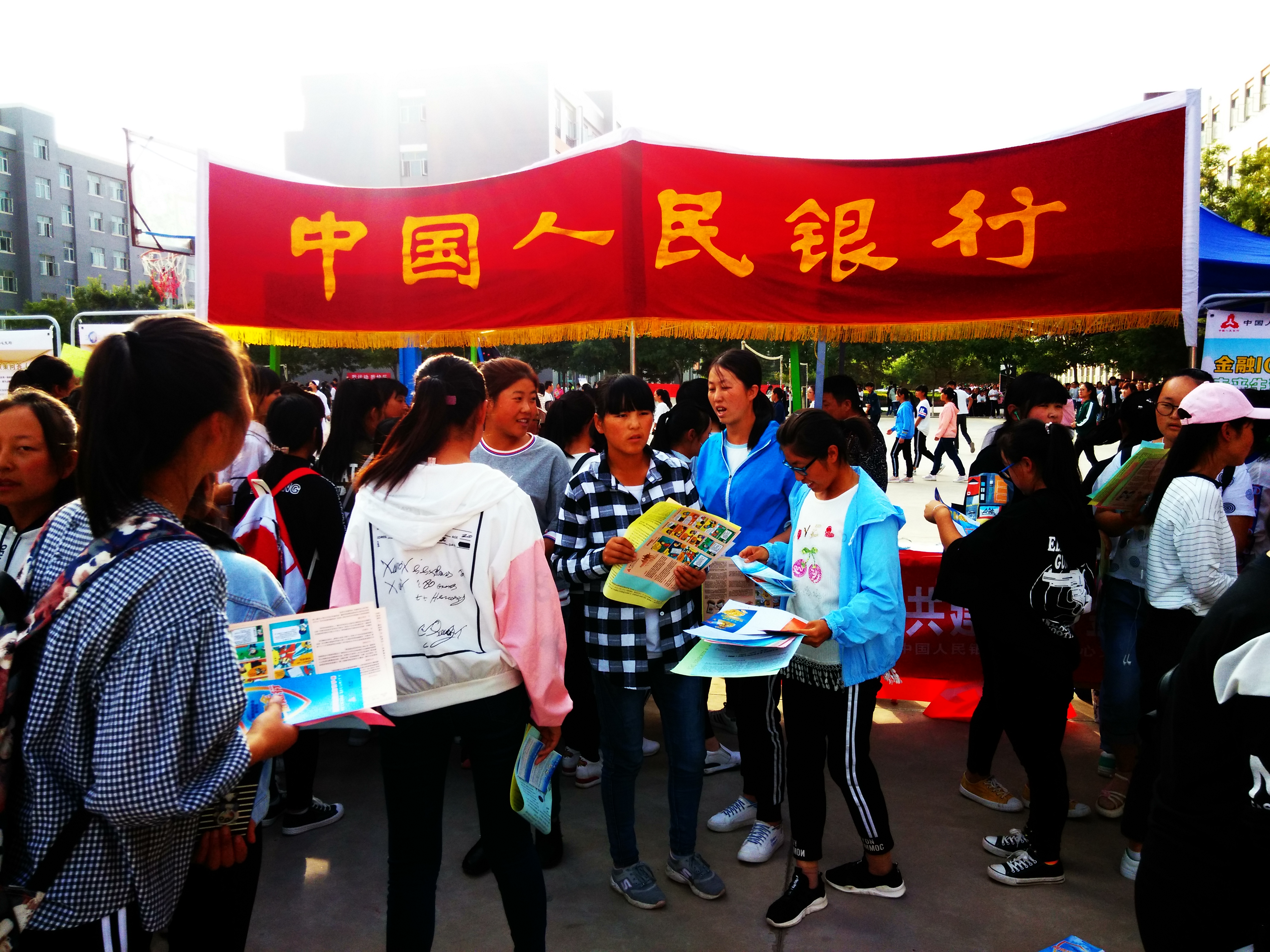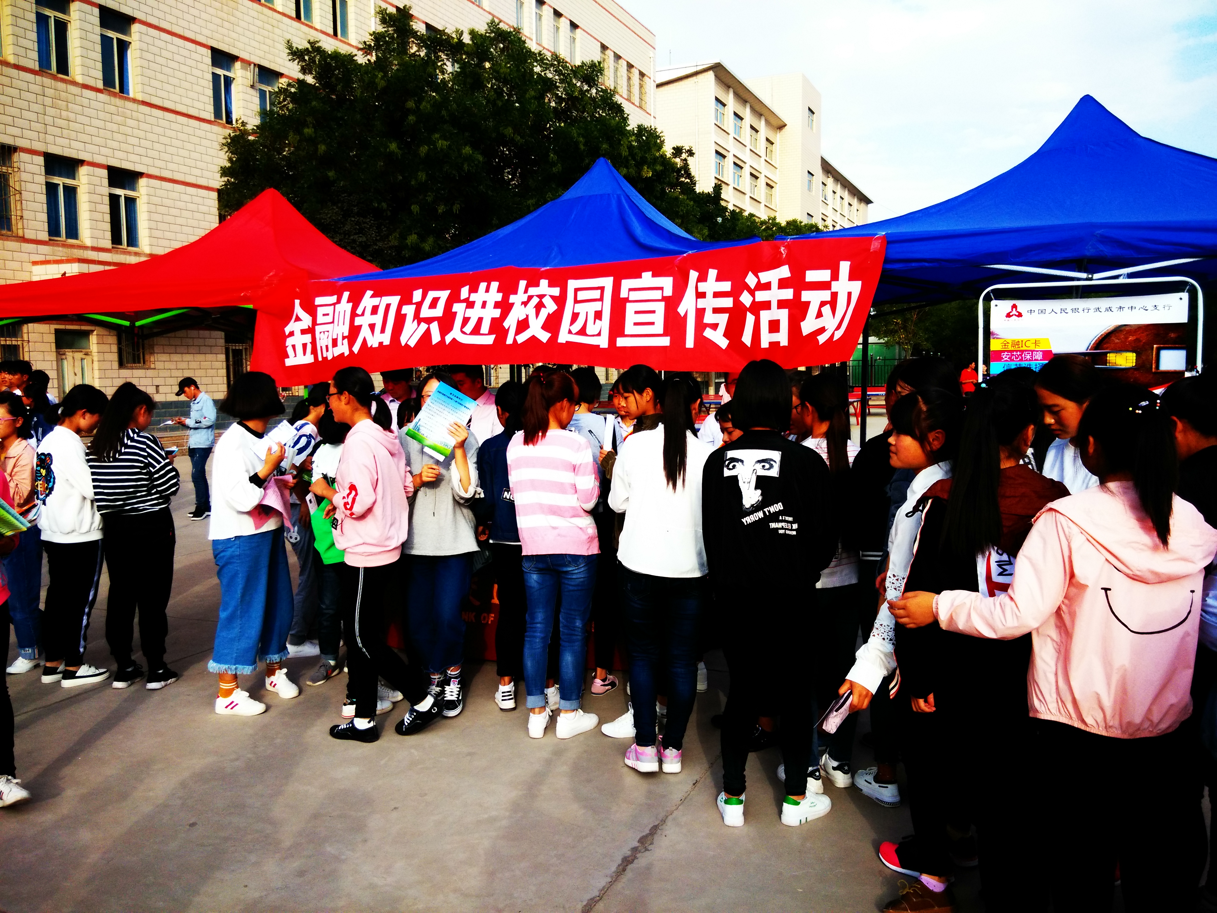 ???? 為幫助和引導大學生群體牢固樹立金融安全意識,9月21日下午,學生工作處邀請中國人民銀行武威分行、武威農(nóng)商銀行、交通銀行武威分行在學院尚德樓南操場開展了“送金融知識進校園”宣傳活動,全院學生積極響應(yīng)號召,有1000余人參加了此次活動。
